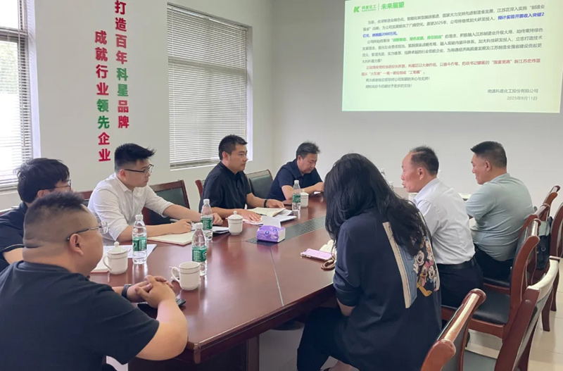 2025年9月11日下午,南通市發(fā)改委經(jīng)濟運行調節(jié)處處長王帥軍,四級主任科員俞榮、姬一峰,海安市發(fā)改委黨組副書記、副主任楊成龍,白甸鎮(zhèn)副鎮(zhèn)長郭勇及經(jīng)發(fā)辦相關負責人蒞臨南通科星化工股份有限公司開展走訪調研工作。此次調研旨在深入了解企業(yè)發(fā)展現(xiàn)狀,傾聽企業(yè)需求,為企業(yè)排憂解難,助力企業(yè)高質量發(fā)展??菩嵌麻L吳龍鐵及副總經(jīng)理劉小燕在工廠行政樓會議室熱情接待了來訪領導,并進行了深入交流。